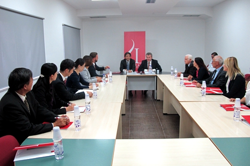 代表团还走访了阿尔巴尼亚两所著名的私立大学——阿尔巴尼亚商学院(阿商院)和卢阿拉西大学(卢大)。在与阿商院院长科乔拉里(Irakli Koçollari)、董事长贝佐(Ylber Bezo)以及卢大校长马拉伊(Arben Malaj)的会谈中,双方就联合培养机制进行探讨。彭龙邀请阿商院加入由北外发起的“全球商学院联盟”。会谈结束后,彭龙校长接受了当地媒体的采访,详细介绍了北外的办学特色和理念,希望通过开展师生交流、科研合作增强中阿高校间的互动,为中阿人文交流做出贡献。采访内容在当晚的电视新闻中滚动播出。