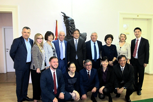 代表团随后访问了阿尔巴尼亚科学院,与科学院院长贝奇拉伊(Gudar Beqiraj)、副院长科尔库迪(Muzafer Korkuti)等专家进行了会谈。贝奇拉伊院长为代表团举行了隆重的欢迎仪式。他感谢北外多次邀请科学院知名学者访华,希望与北外进一步深化合作关系。彭龙与贝奇拉伊探讨了签署战略合作协议的意向,期待与阿科学院深化在阿尔巴尼亚研究、巴尔干研究等领域的合作。阿科学院秘书长托列(Vasil Tole),文学所所长达多(Floresha Dado)和院士西纳尼(Shaban Sinani)等出席会见。会谈期间,阿科学院授予我校柯静教授2016年度“国家科学奖”。