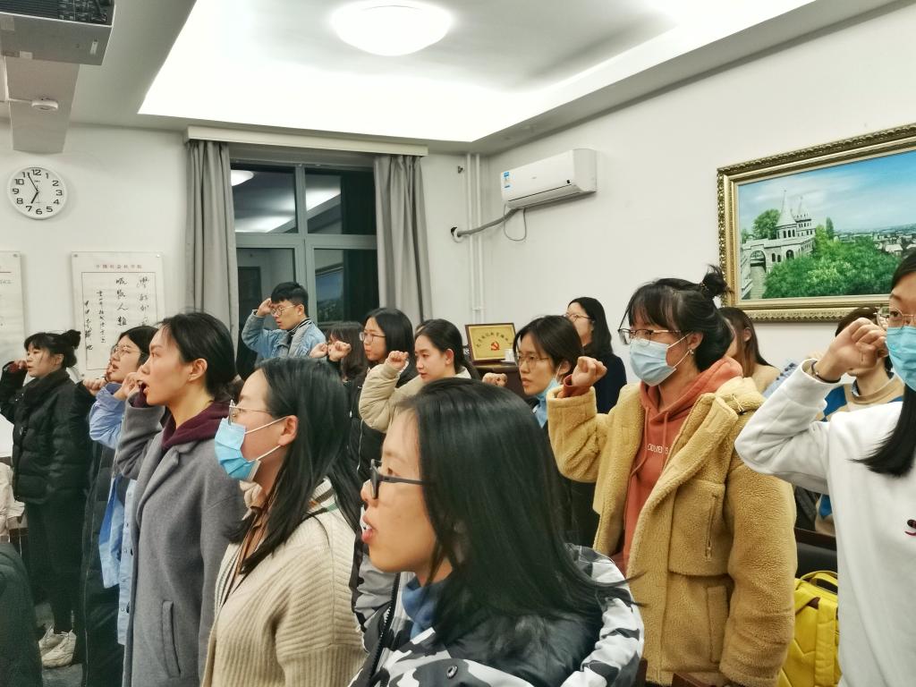 最后,大家在刘凯琳带领下重温入党誓词。全体党员举起右手,面对党旗庄严宣誓,重温入党初心,不忘党员使命。
