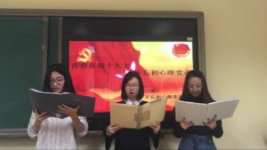 十一月十二日晚五时,17级荷兰语全体同学在逸夫楼413教室开展了本学期第三次团活动-“青春喜迎十九大 不忘初心跟党走”主题班会。熟悉的团歌奏响,全体同学起立,齐唱团歌后,在团支书贾文荟组织下班会正式开始。本次班会一改往日严肃的氛围,以活跃的精神面貌,创新的活动形式,最大化地激发了同学们爱国情怀,和建设社会主义事业的伟大决心。由于仍然身处学校,与社会校外社会的联系不深,为了引导同学融入团活动氛围,增加对十九大精神的了解,团支书精心选取了”画说党史””解读十九大精神”等一系列优秀的纪录片,以同学们感兴趣的漫画形式,将共产党自成立以来曲折前进的历史一一诉说,耳熟能详的爱国歌曲萦绕耳畔,一幅幅感人至深的画面映入眼帘,迅速地调动了同学们的情绪。”党的全国代表大会”一片简略概括了十九大的中心思想,为同学们理清了中国未来的发展方向,为!学们各抒己见做出了良好的铺垫。