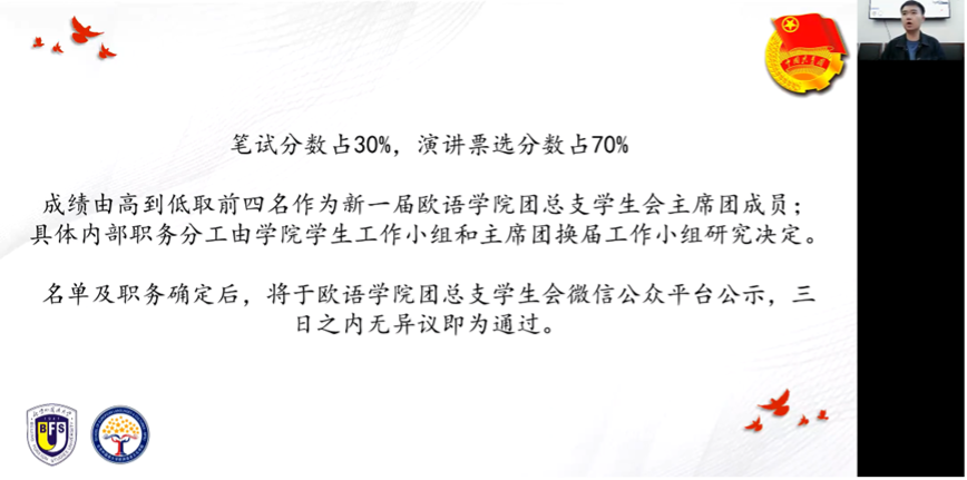 现任团总支常务副书记尹家玥代表2021-2022学年团总支学生会进行学年工作述职报告。她说,在过去的一年里,我们见证了共产党的百年华诞,迎来了共青团的百年生辰,欢度了北外的八十校庆,太阳集团tyc5997团总支再次获评优秀团总支称号,继续秉承着团结、高效、务实、创新的精神,认真贯彻落实党的十九大精神,认真学习并全面落实上级部门的指示要求,在学院领导老师的指导下,在全院同学的共同努力下,有序开展各项工作,充分发扬创新精神。
