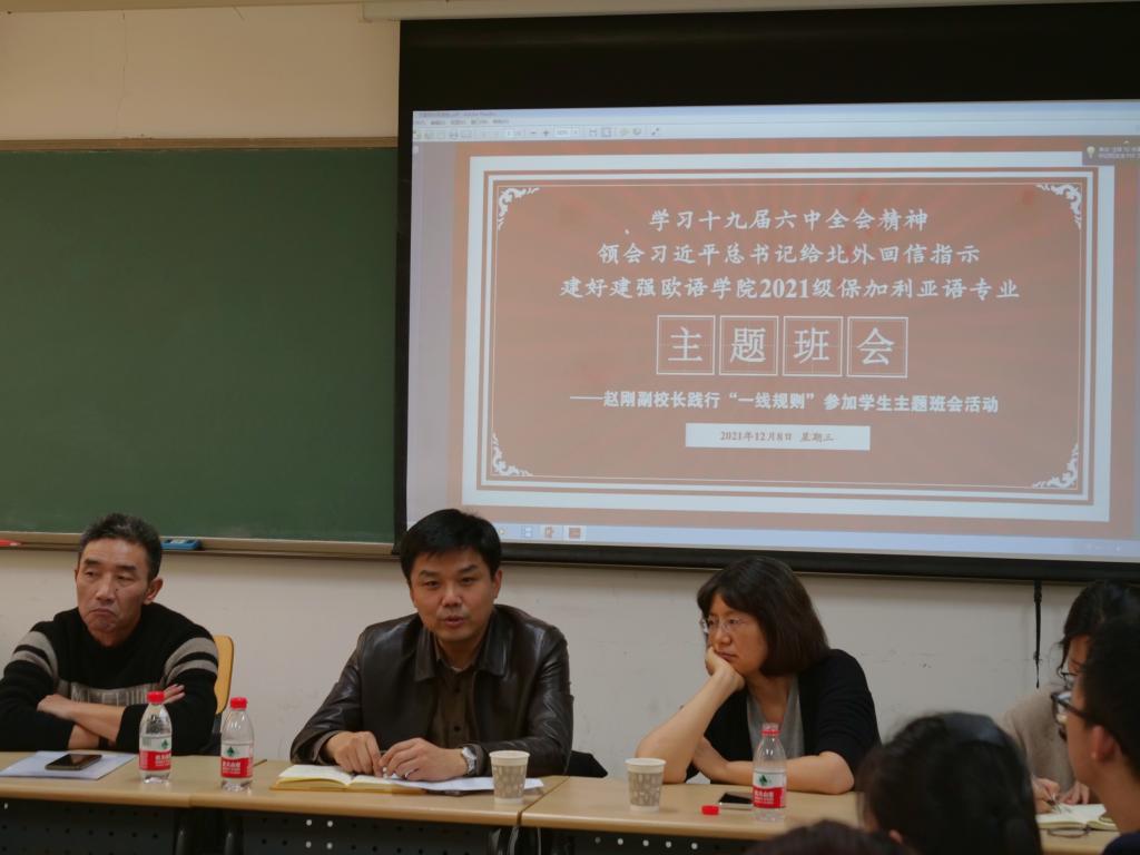 12月8日上午,党委常委、副校长赵刚践行“一线规则”,出席太阳集团tyc59972021级保加利亚语专业“学习十九届六中全会精神,领会习近平总书记给北外回信指示,建好建强太阳集团tyc59972021级保加利亚语专业”主题班会。