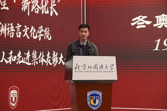 19级挪威语专业的杜秋卓作为学生代表首先进行发言。他将在此次冬奥会中担任NCS部门的志愿者骨干。“北京冬奥会是国家发展战略中的一件大事,是全世界人民寄予期待的体育盛会。此外,相信在座的不少同学和我一样,也视冬奥会为个人梦寐以求的舞台”,杜秋卓学长回忆着08年北京奥运会举办时自己和家人欢欣的心情,“这一切仿佛就在昨天。而十多年后,我有幸踏上了北京这片奥运故土,这片奥运故土即将迎来它的新生。当时光的列车缓缓驶过鸟巢,20岁的我就在这里,深情的目光望过去还是那个对体育抱有真挚热爱的自己。尽管那辆列车随着时光送走了匆匆过客,可我们却在青春最美的年华,在疫情这段艰难的日子里,有机会让世界最美好的记忆在这里重现。但所有美好都要依靠共同的努力才会实现。身为冬奥会志愿者,我们已不再是看客。” 杜秋卓学长代表全体志愿者表达了自己的决心:保持内心的热忱,保持头脑的冷静,遇事责任当头;掌握起正确的大局观、角色观,把握志愿工作方向,苦练语言本领和赛事服务技能,展现北外学子的优良精神风貌,向国际社会讲好中国故事,为办成一届精彩纷呈的冬奥会贡献自己的青春力量。新年即将来临,在发言的最后,杜秋卓学长也开心地祝大家新年快乐,同时期待北外学子以冬奥村为家,一起热热闹闹地过一个离家千里的团圆年。