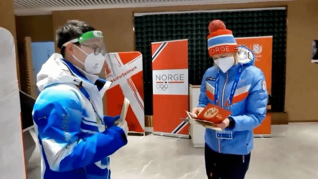 2022年2月1日,北京外国语大学驻北京冬奥村志愿者为参加北京冬奥会的挪威代表团送去新春祝福。
