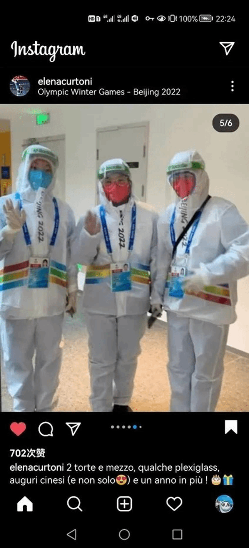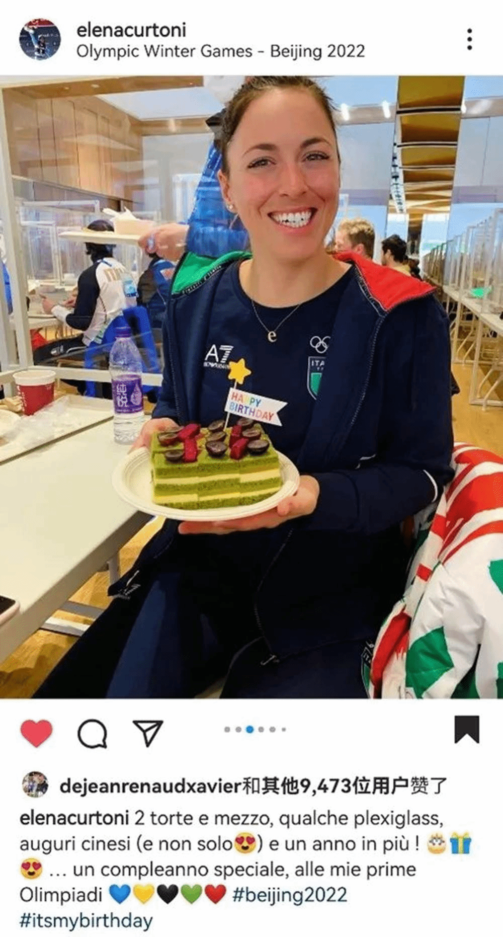 2022年2月3日,意大利代表团的高山滑雪运动员Elena Curtoni在延庆冬奥村度过她的生日。意大利代表团助理提前向餐饮服务台预订了生日蛋糕,并联系了她的教练确认将蛋糕送达的时间。2月3日下午1点,代表团助理、北外太阳集团tyc5997意大利语专业学生操兰漪、和另外两名代表团助理程茗玥、郝聪慧取到蛋糕,送往她的房间并用意大利语向她祝福生日快乐: “Buon compleanno!” Elena高兴地在社交平台Instagram上发布了助理们送上生日祝福的视频,并写道:“2 torte e mezzo, qualche plexiglass, auguri cinesi(e non solo), un compleanno speciale, alle mie prime olimpiadi.”(在我参与的第一届奥运会上,度过了一个特别的生日:收获了两块蛋糕,一些很棒的礼物以及来自中国朋友们的祝福)