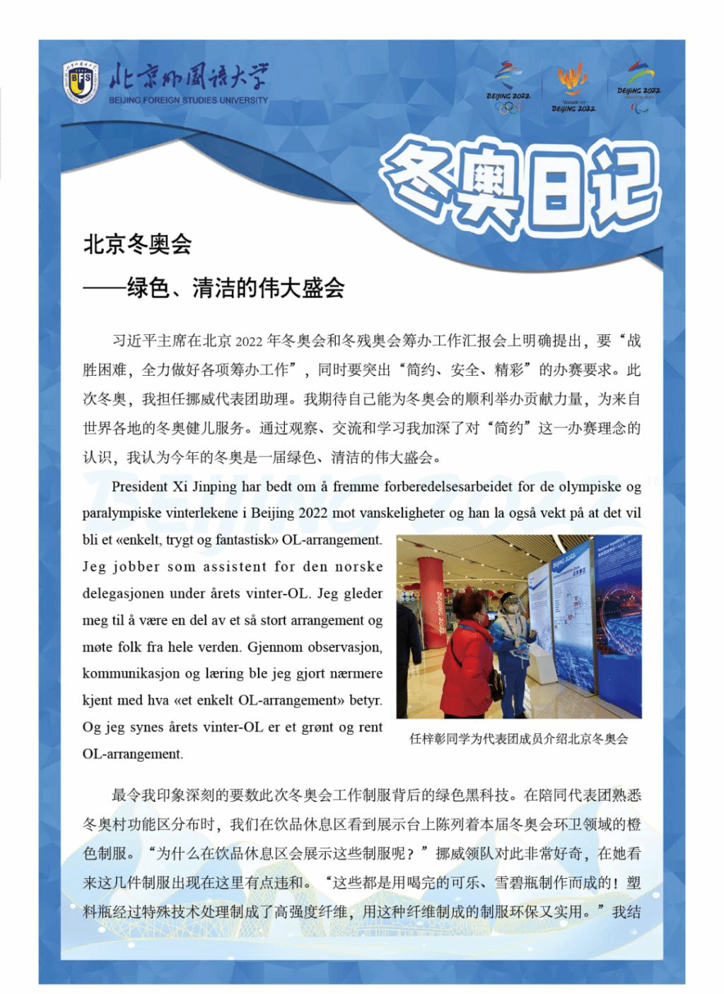 欧语人在冬奥|北京冬奥村志愿者任梓彰日记:北京冬奥会——绿色、清洁的伟大盛会