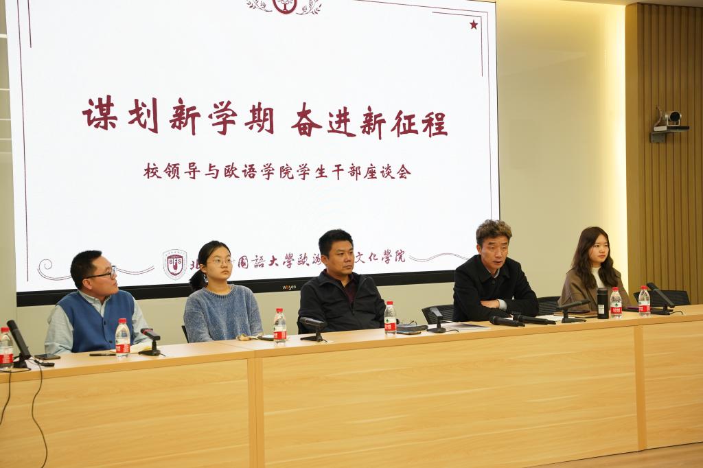 座谈会上,团学联主席团成员阮思潼、刘雨霏、葛雨尧、贺培荣先后发言畅谈学习党的二十大精神的体会,汇报学生干部带领全院学生已经开展和计划开展的工作。团学联宣传部部长董骁旸、传媒部部长徐子棠、权益部部长王一凡、文体部部长赵鄢祺等同学发言表示,在学校党委领导下,要继续深入学习领会党的二十大精神,牢记习近平总书记给北外老教授回信的嘱托,结合新学期新要求谋划学习和工作,服务学生成长,朝着“三有人才”目标勇毅前行。