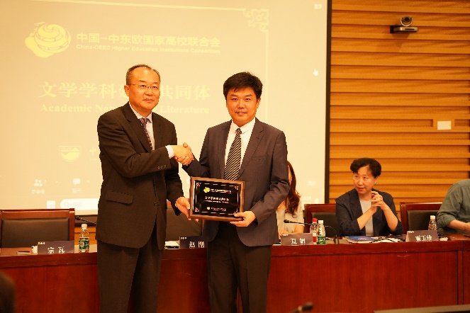 开幕式结束后举行了中国-中东欧国家高校联合会文学学科建设共同体启动仪式。宗瓦副秘书长对中国-中东欧国家高校联合会文学学科建设共同体的成立表示了衷心的祝贺。他指出,文学学科共同体建设对于推进中国与中东欧国家民心相通,服务“一带一路”建设,具有重要意义。中国教育国际交流协会将持续支持共同体工作。随后,宗瓦副秘书长向赵刚副校长授牌。