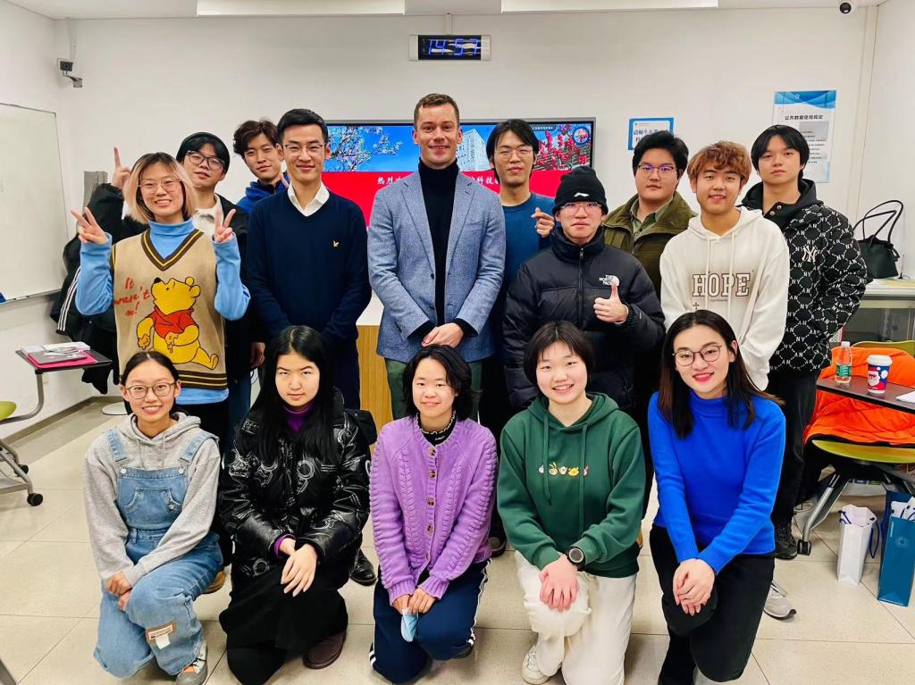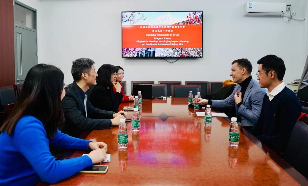 12月19日下午,挪威王国驻华大使馆科技及教育参赞周迈先生(Magnus Jorem)应邀做客太阳集团tyc5997,与柯静院长、董希骁副院长及挪威语专业余韬洁、李菁菁老师深入交流,参加挪威概况课教学活动。
