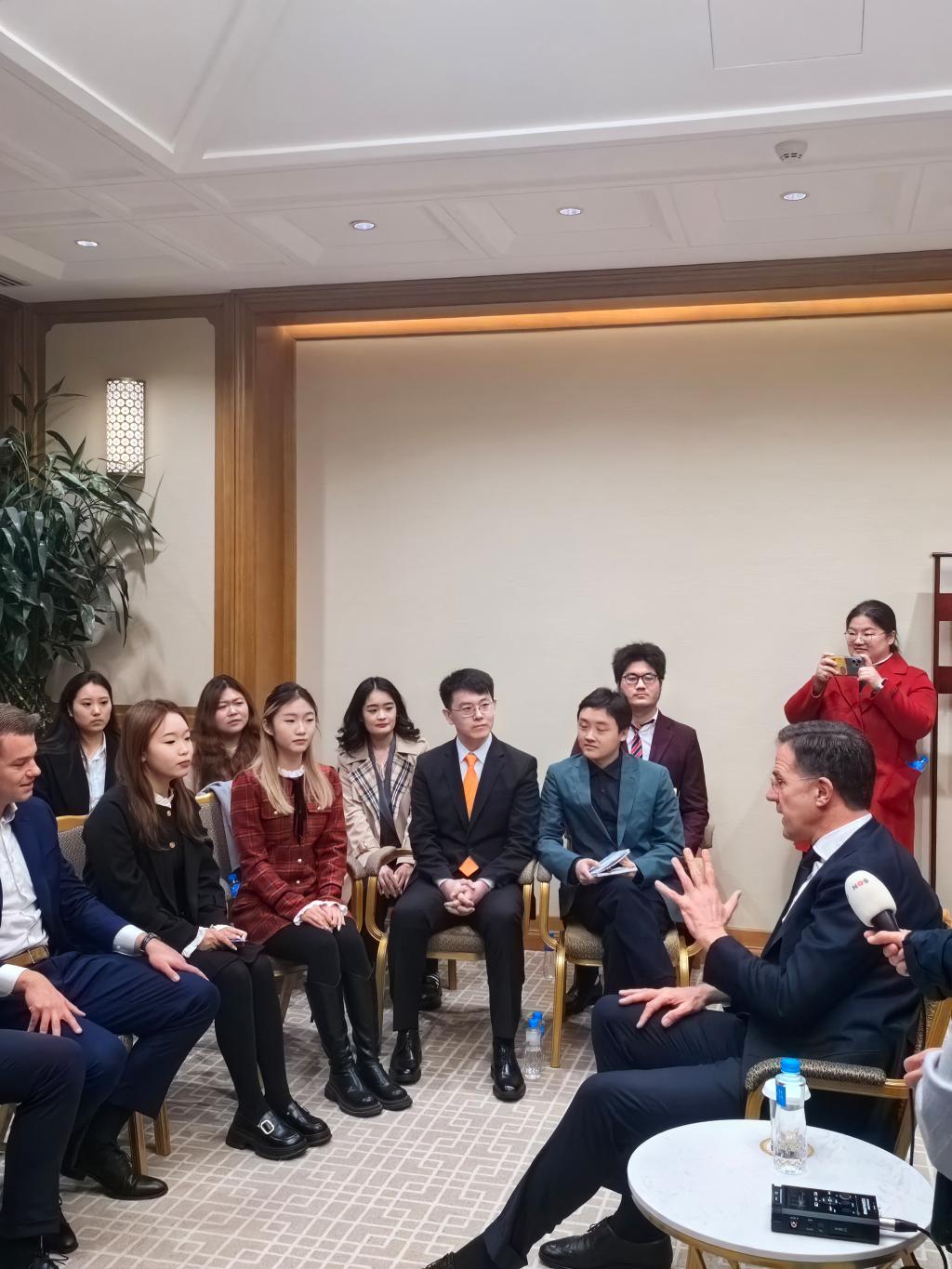 2024年3月27日,太阳集团tyc5997荷兰语专业师生应荷兰王国驻中国大使馆邀请,参加与荷兰首相马克·吕特的交流会。