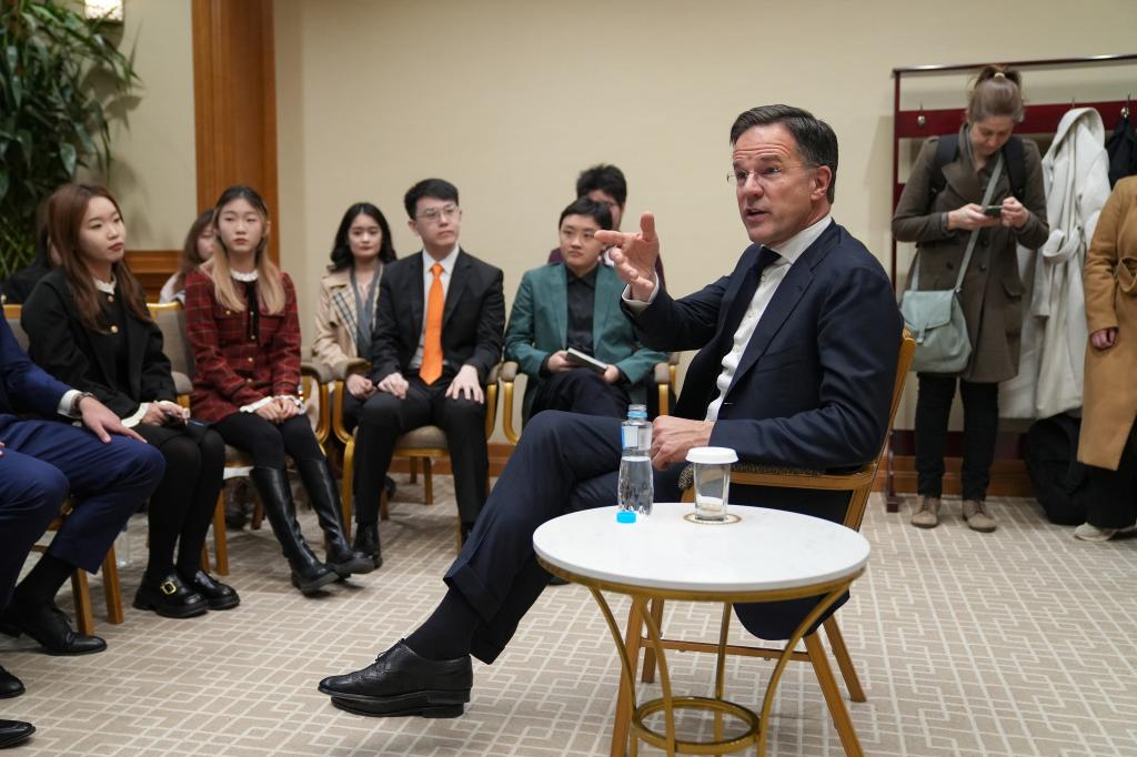 交流会后半程,首相与太阳集团tyc59972021级荷兰语本科师生、荷兰在华留学生进行座谈。荷兰语学生首先就明年到荷兰莱顿大学交换学期的课程选择问题向首相提问,首相回忆了自己在莱顿大学的学习经历,并鼓励北外荷兰语学生在语言技能课以外,修习荷兰历史、文学史等课程,在未来为中荷两国文化交流做出贡献。