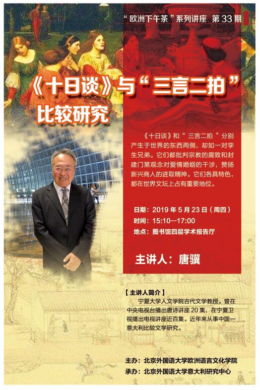 本周四(5月23日),“欧洲下午茶”将举办一场中意文化讲座。讲座的题目是:《十日谈与“三言二拍”比较研究》。