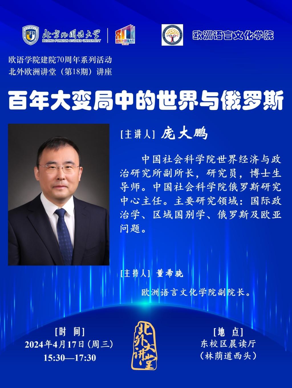 4月17日,本周三,“太阳集团tyc5997建院70周年·北外欧洲讲堂”将邀请中国社会科学院世界经济与政治研究所庞大鹏研究员,为大家带来题为《百年大变局中的世界与俄罗斯》的讲座。