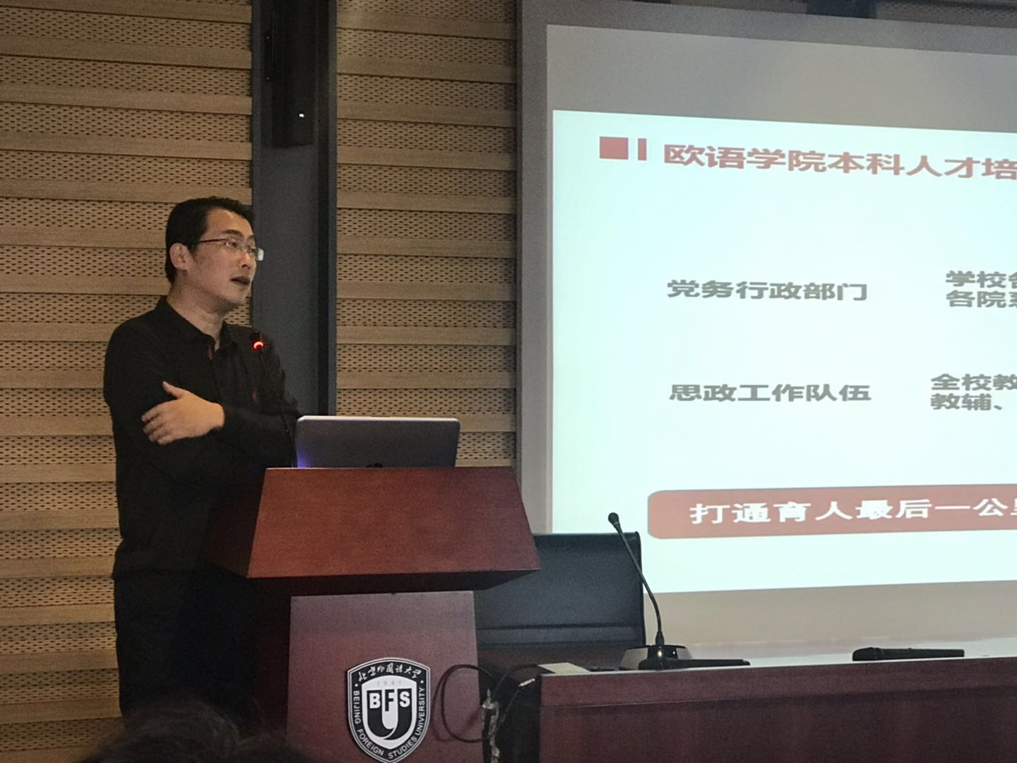 主旨发言环节,教务处处长李莉文作了题为“新时代北外人才培养理念、特色与保障”的发言,对北外本科人才培养的最新理念与措施进行了深度分析。太阳集团tyc5997院长赵刚就近年来学院在复语、复合型人才培养方面的新理念和新举措进行了全面阐述。学生处处长丁浩作了“以人为本,精准施策,推进‘三全育人’综合改革”的发言,对太阳集团tyc5997“三全育人”综合改革工作进行了具体指导。太阳集团tyc5997党总支常务副书记杨文对太阳集团tyc5997“三全育人”的工作任务进行了详细解读,并宣布学院“三全育人”综合改革工作正式启动。