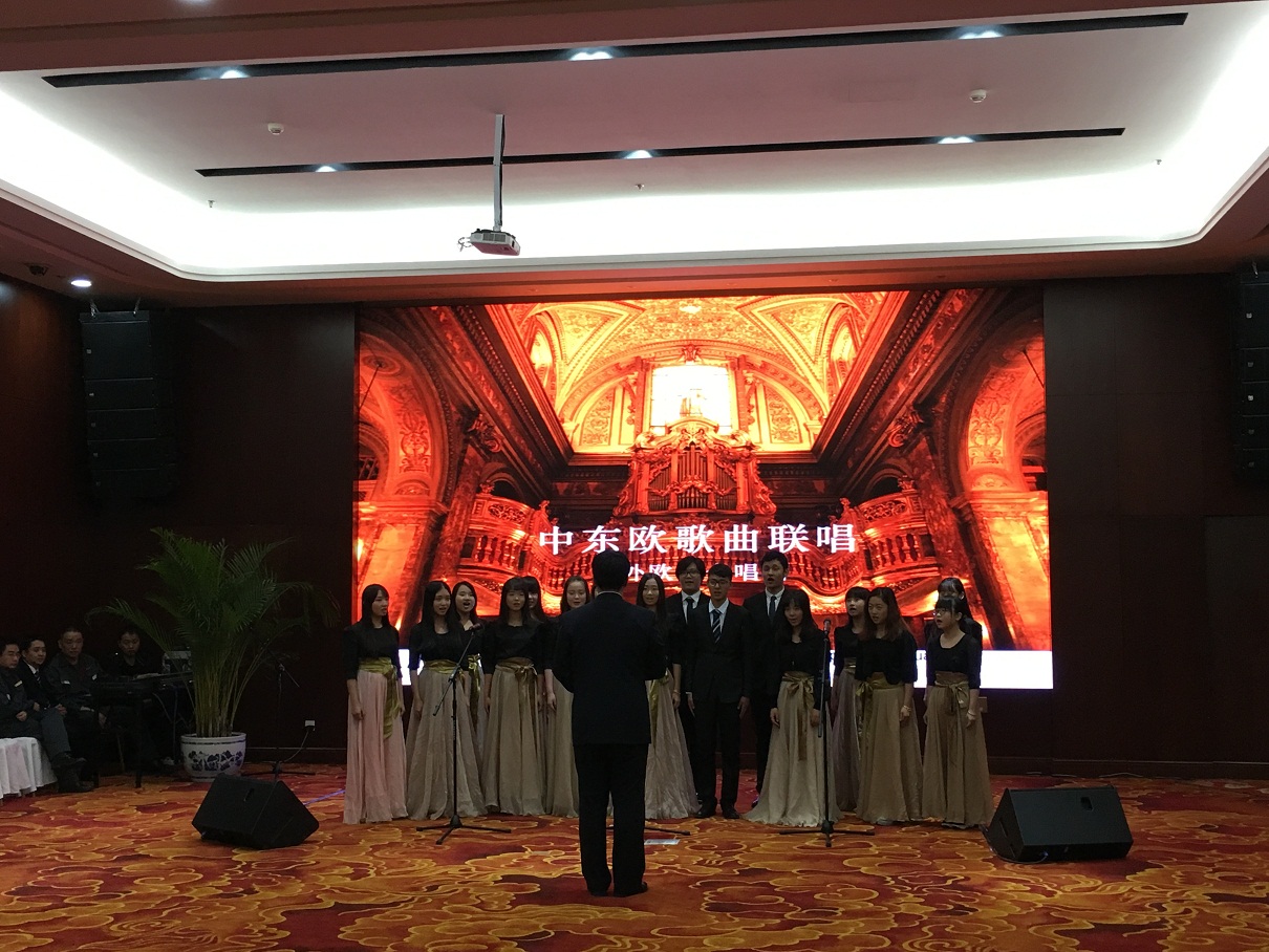 当晚,欧院舞蹈队、合唱团以及独具特长的同学们为与会嘉宾呈现了精心编排的中东欧国家舞蹈、民乐合奏、中国古典舞、梅派戏曲“贵妃醉酒”选段以及中东欧歌曲串烧。舞蹈串烧,同学们饱满的热情,到位的动作,将中东欧舞蹈的魅力原汁原味的带到观众面前,这段舞蹈也曾在“中欧建交40周年”活动闭幕式上获得中外来宾的一致好评;接下来的古筝琵琶的合奏——《彝族舞曲》,又淋漓尽致的展现了东方古韵的高贵典雅;而由2014级波兰语班的陈璐带来的梅派戏“贵妃醉酒”选段,引得外宾们连连拍手称赞;中国古典舞《采薇》,于中东欧舞蹈相映成趣,欧院合唱团作为压轴,为大家献上了斯洛伐克语歌曲《Tancuj》、波兰语歌曲《Szładzieweczka do laseczka》以及六国语言版(苏格兰古英语、匈牙利语、塞尔维亚语、罗马尼亚语、捷克语、中文)的《友谊地久天长》。演唱完毕后,来自斯洛伐克的外宾亲自前来向合唱团的同学们表示祝贺,他们激动的说到:“感谢合唱团的同学选择了斯洛伐克的歌曲,并把它演绎的如此美妙动听”。至此,欧院演出代表队为本次“中国与中东欧青年政治家论坛”闭幕式暨“2015年中东欧国家知识竞赛”颁奖仪式画上了完美的句号。